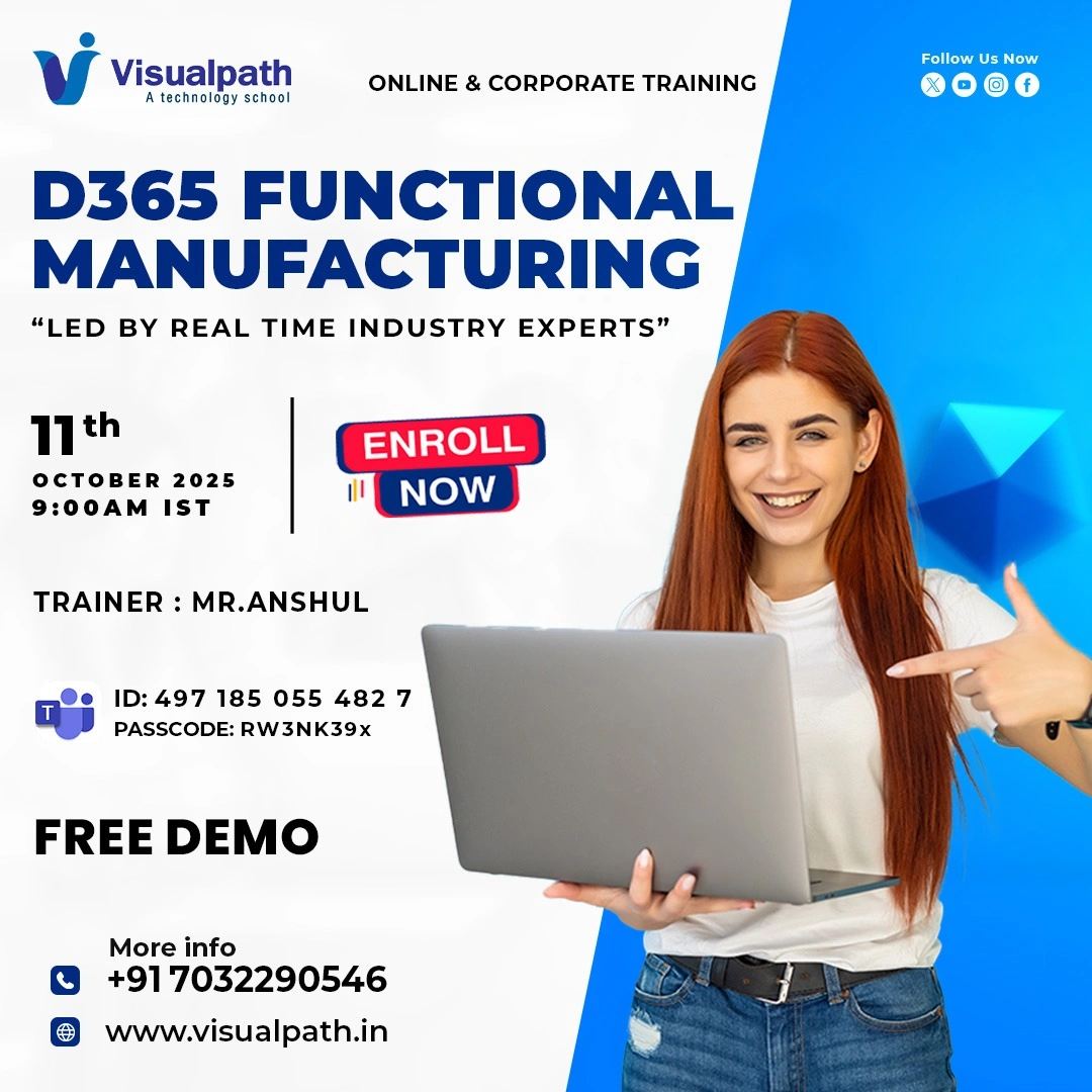 Visualpath provides expert-led Dynamics 365 Functional Manufacturing Training in Hyderabad, offering hands-on learning and real-world applications. This globally accessible program equips professionals with Microsoft Dynamics 365 (F&O) skills to optimize business operations and enhance career growth in enterprise solutions.